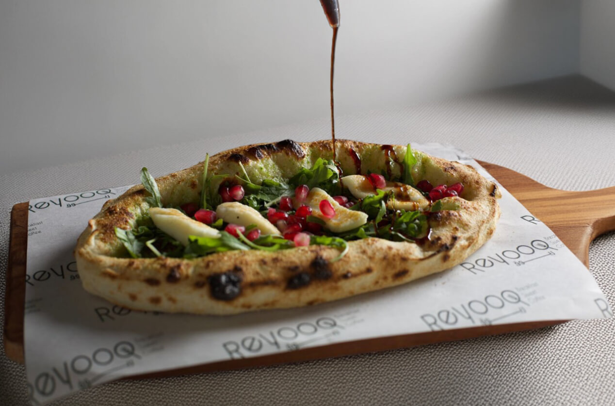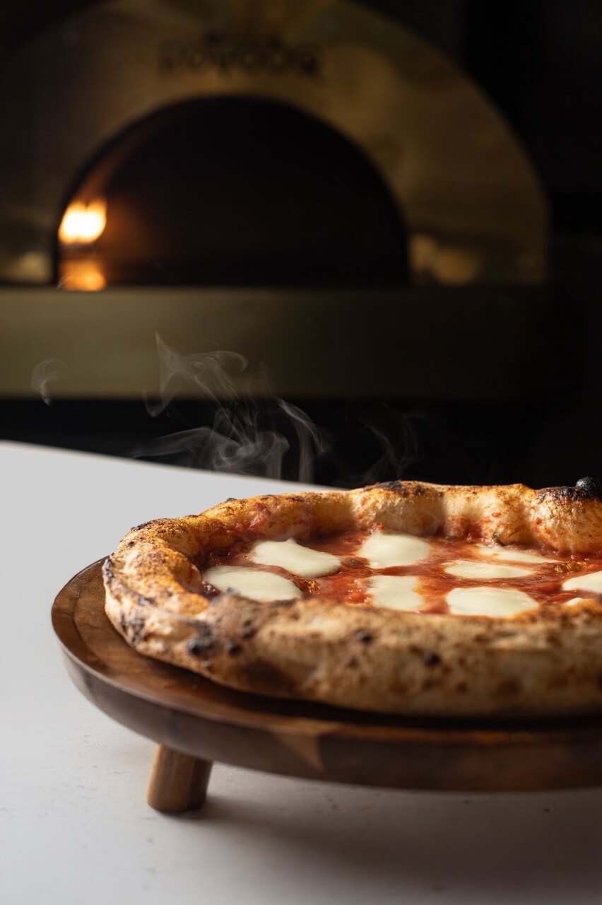 بيتزا محضّرة بعجينة نابولية خفيفة تُخبز على حرارة عالية لتعطي أطراف مقرمشة وقلب طري. تُغطّى بصوص الطماطم الإيطالي والـموزاريلا الذائبة، وتعلوها تشكيلة خضار طازجة